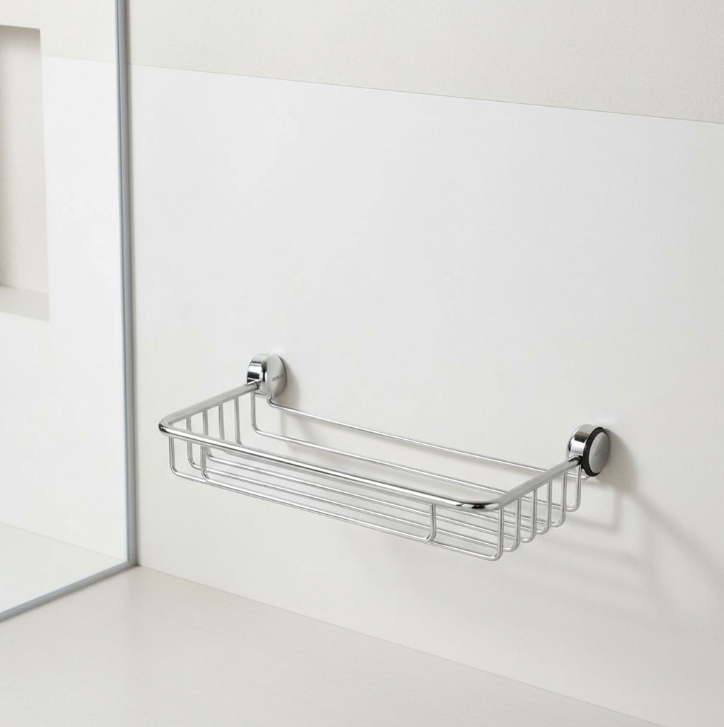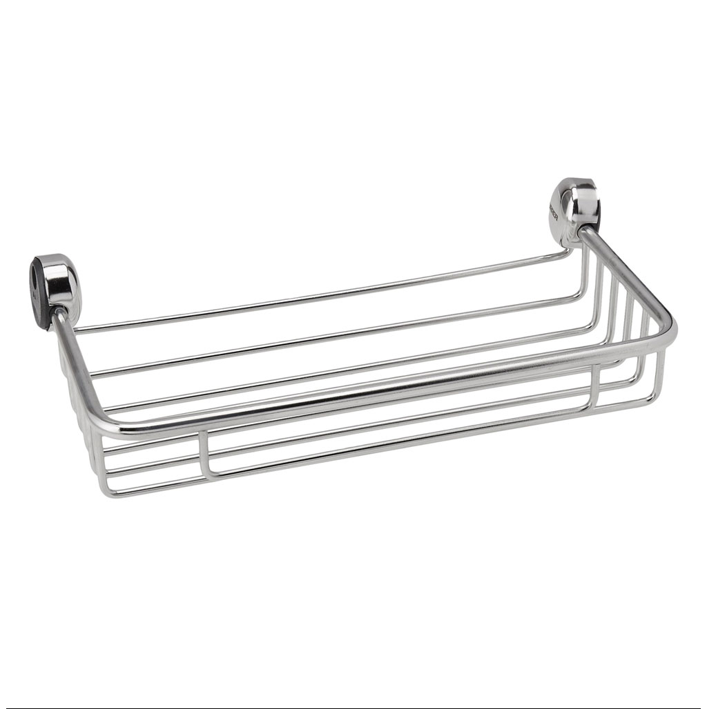 Fabricada en acero inoxidable T-304, con diseño rectangular y acabado brillante plateado, ideal para colocar jabones, champús o accesorios dentro de la regadera.