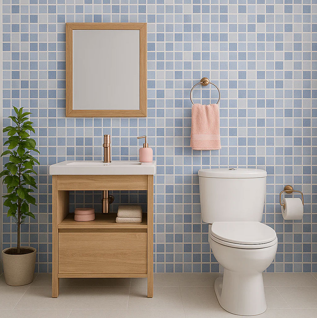 Piso cerámico 20 × 20 cm con patrón geométrico; ideal para acentos “tipo regaderas” y muros decorativos.