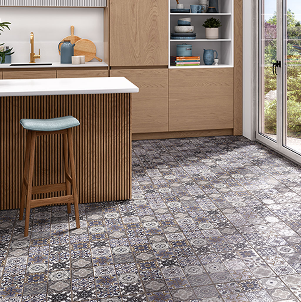Loseta 37 × 37 cm estilo talavera en azul profundo, con efecto mate‑brillo para cocinas o patios.