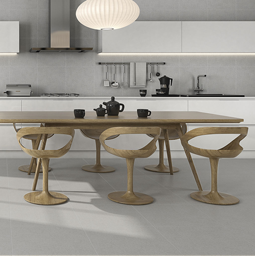 Cerámico 55.5 × 55.5 cm efecto granito gris; disponible en 1ª y 2ª selección.