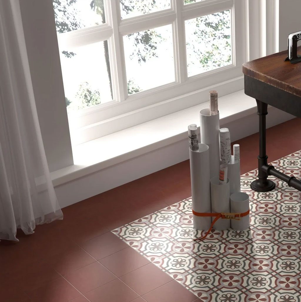 Esta porcelánica evoca azulejos hidráulicos portugueses con su intenso y cálido color bermellón, ideal para crear ambientes acogedores con carácter.