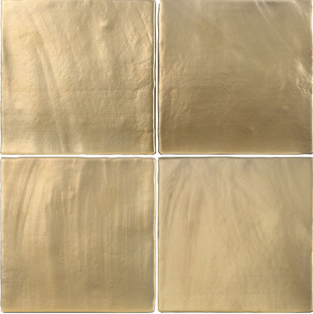 Azulejo cerámico 15×15 cm en tono oro mate y relieve artesanal.