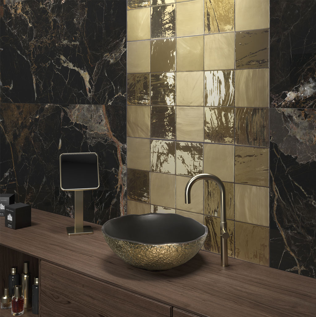 El dorado mate sobre textura manual crea una estética sofisticada y discreta, ideal para espacios que buscan un lujo sutil y refinado, sin brillos intensos.