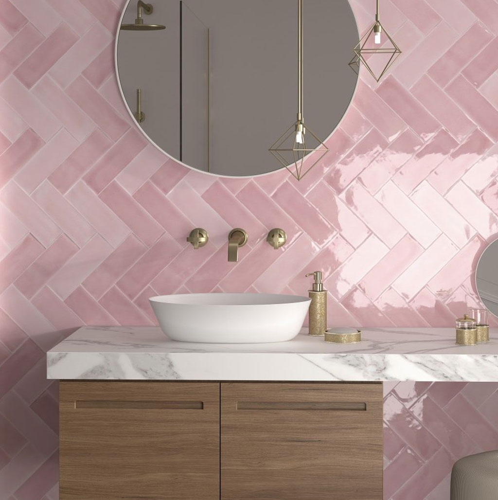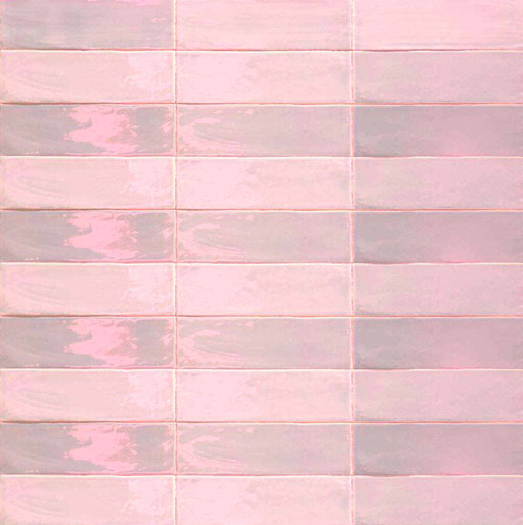 Revestimiento cerámico 7,5×23 cm en rosa brillante con relieves y destonificaciones únicas.