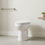 Taza blanca con fluxómetro ecológico expuesto de palanca, diseño institucional, ideal para espacios públicos.
