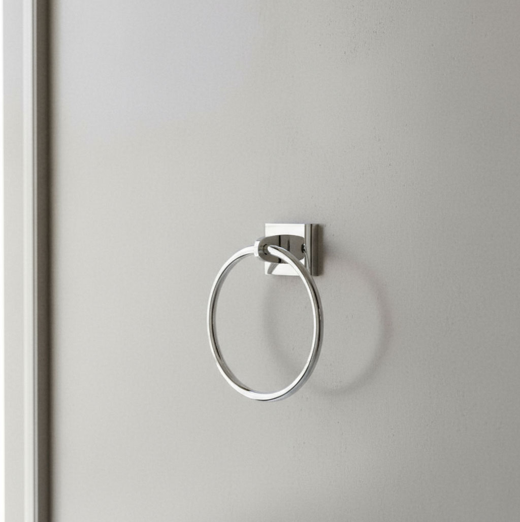Barra corta de la línea LIA en acabado cromado, hecha de metal resistente, ideal para espacios compactos donde se requiere una solución discreta para colgar toallas de mano o de lavabo.