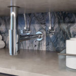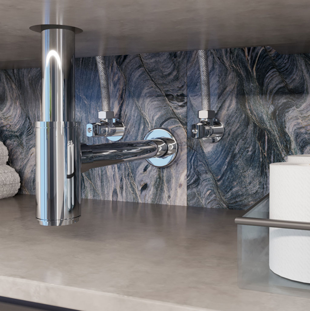 Válvula de paso angular en latón cromado, con roscas internas y externas de ½″, diseñada para detener o permitir el flujo de agua en lavabos, fregaderos o WC.