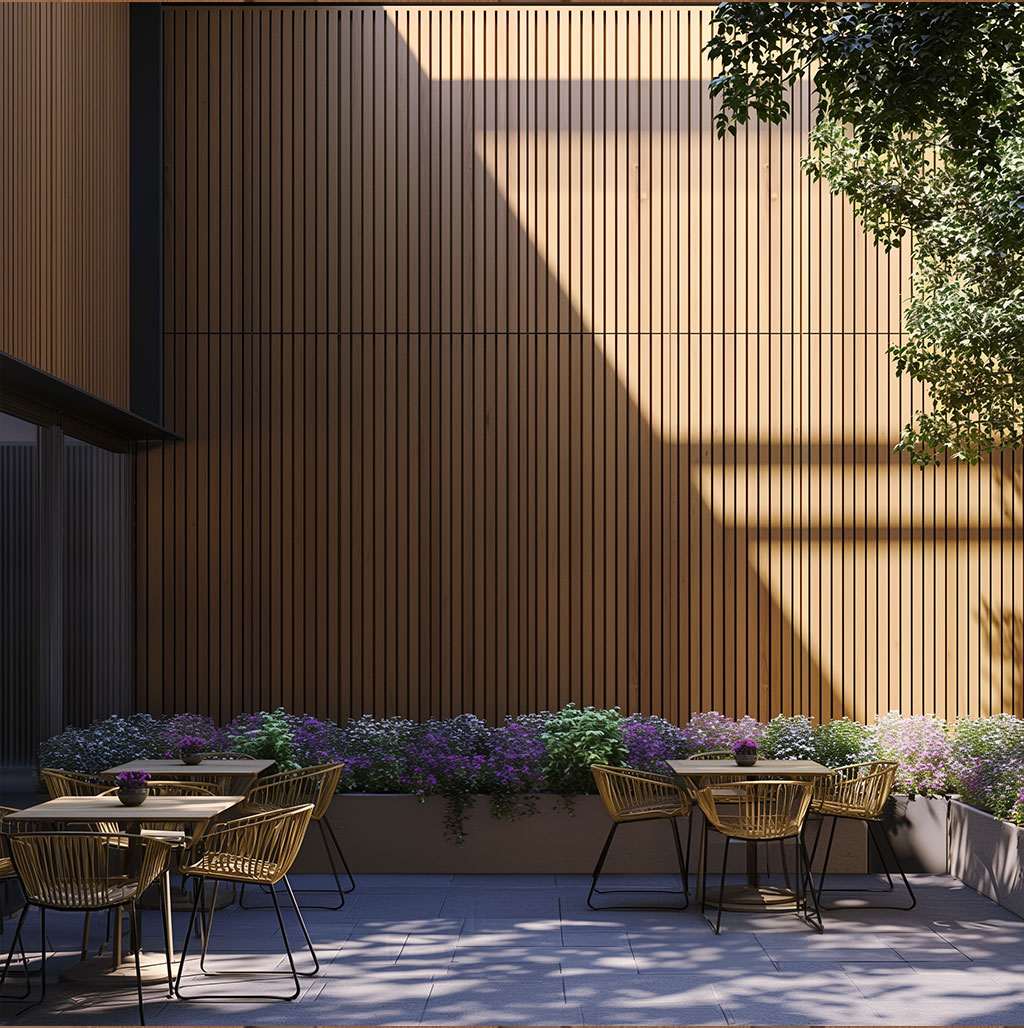 Este panel en tono café está especialmente diseñado para uso exterior, ofreciendo resistencia y durabilidad frente a la intemperie. Su acabado natural aporta un toque cálido y elegante a las fachadas, terrazas o muros decorativos.