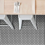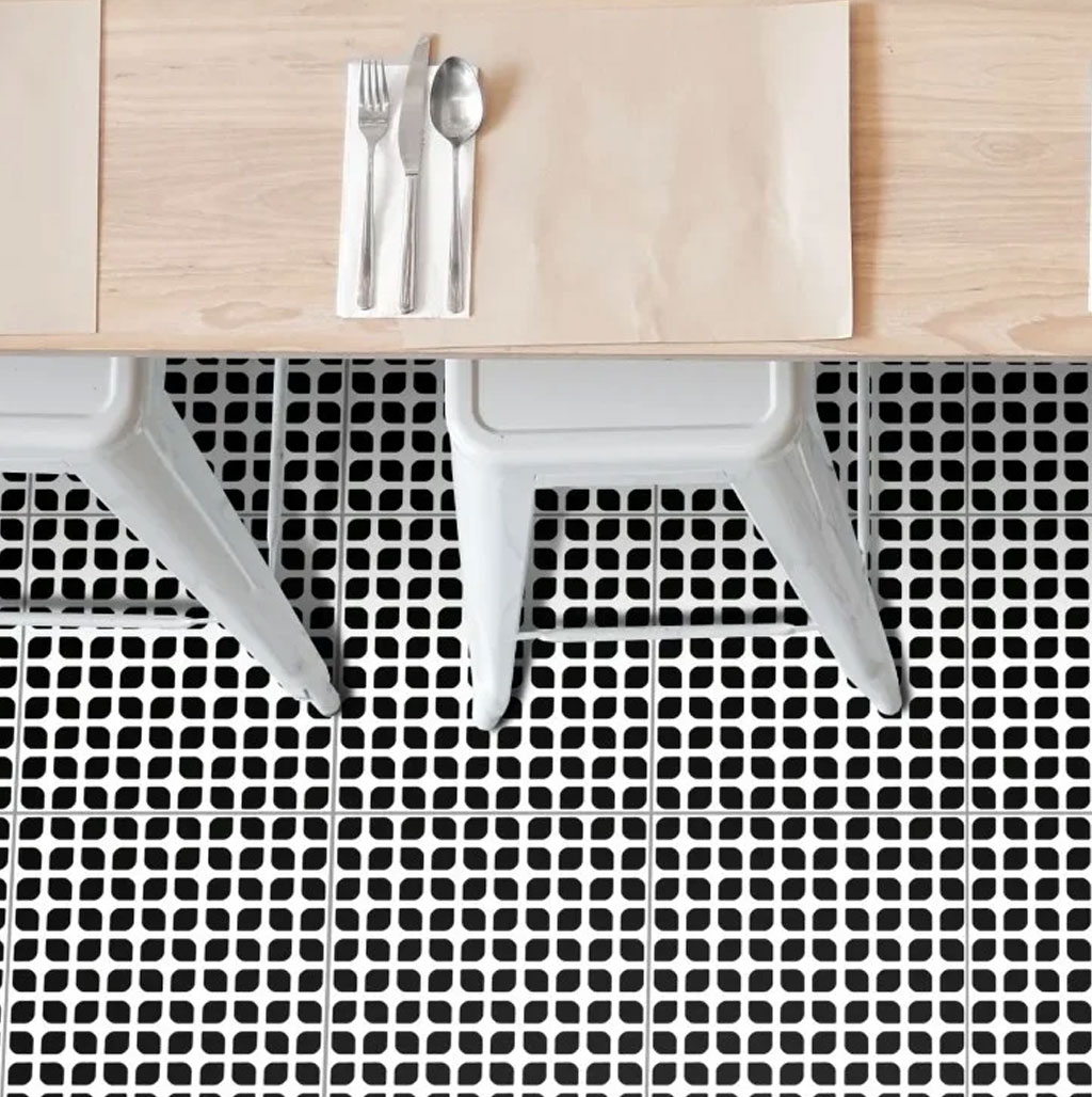 Baldosa porcelánica 20 × 20 cm, acabado mate, con diseño geométrico complementario a yang inspirado en yin-yang.